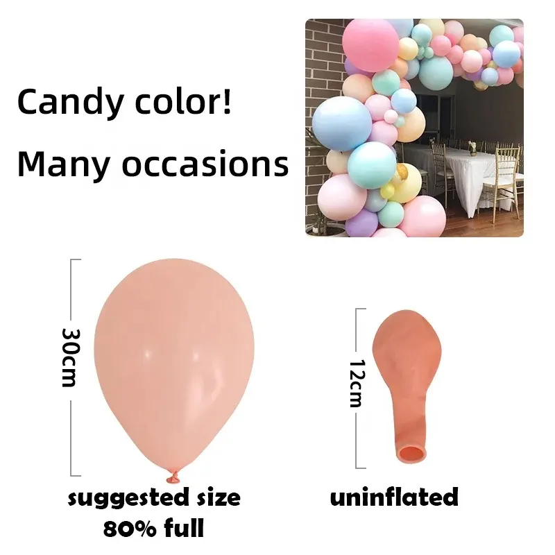 Sản xuất nghiêm ngặt: Dây chuyền sản xuất hiệu quả cao kết hợp với kiểm tra chất lượng nghiêm ngặt (các nhà máy được chứng nhận ISO 9001), tất cả các quả bóng macaron 12 inch đã trải qua nhiều thử nghiệm để đảm bảo độ dày đồng nhất (0,25-0,28mm), không có khuyết điểm và tỷ lệ nổ (<0,01%) thấp hơn nhiều so với tiêu chuẩn công nghiệp.