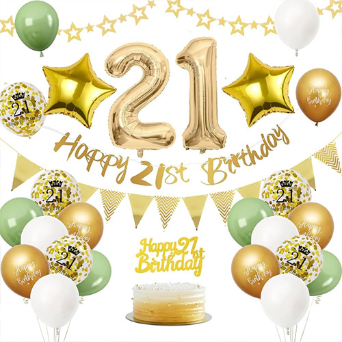 Bộ bóng bay thứ 21: Bộ bóng bay thứ 21 này bao gồm bóng bay cao su, bóng bay giấy bạc, cờ sinh nhật và các phụ kiện khác. Nó rất dễ lắp ráp và có thể làm cho bữa tiệc sinh nhật lần thứ 21 của bạn trở nên trang trọng hơn. Chất lượng cao và khung cảnh tuyệt đẹp như vậy sẽ giúp bạn làm bừng sáng đêm sinh nhật lần thứ 21 của mình và biến đây thành khoảnh khắc quý giá mà con gái, bạn và cả gia đình sẽ không bao giờ quên.