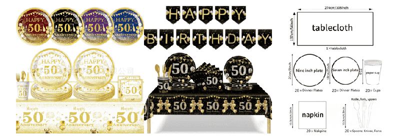Giấy trang trí sinh nhật: là vật dụng cốt lõi của trang trí bánh, tấm thiệp chính lấy dòng chữ "chúc mừng sinh nhật 50 tuổi" làm cốt lõi và kết hợp trang trí bánh chính với pháo hoa, ngôi sao, mũ sinh nhật và các hình dạng khác. Vòng hỗ trợ "50", những đám mây tốt lành, vương miện và các tấm thiệp nhỏ khác, được làm bằng bìa cứng dày và kết hợp với những thanh tre chắc chắn, có thể trang trí bằng bánh nướng nhỏ và bàn tráng miệng với các chi tiết tinh xảo.