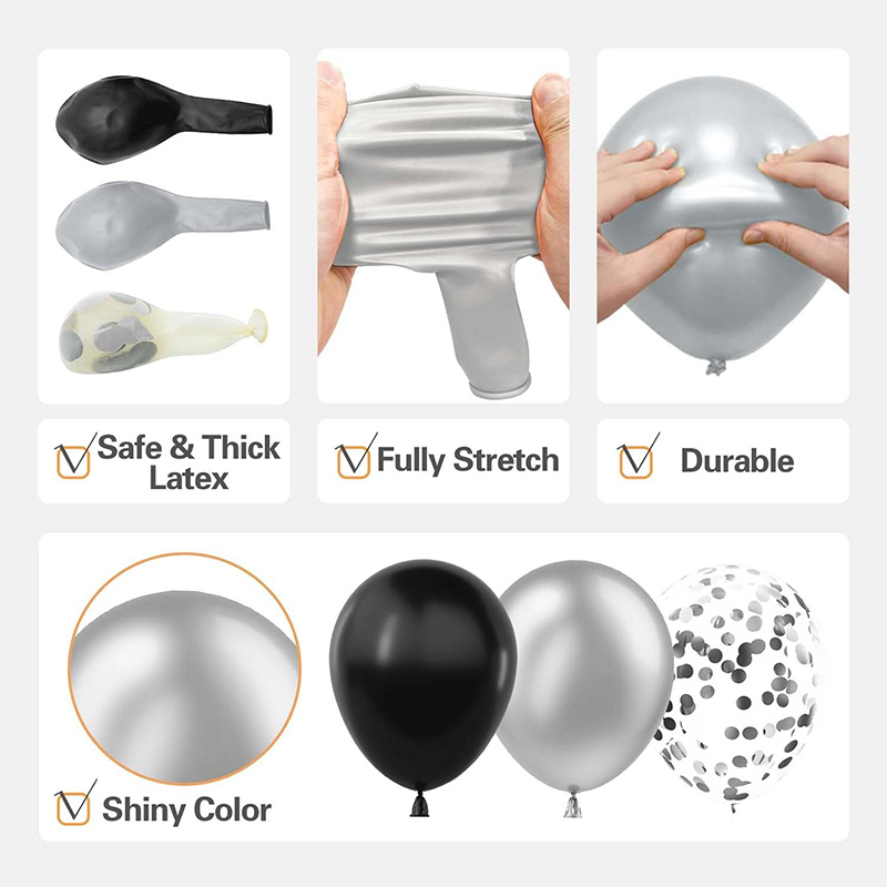 Trang trí bộ dụng cụ vòng hoa bóng bay màu đen và bạc thời trang thường sử dụng bóng bay cao su. Chúng có kích cỡ khác nhau. Màu sắc là đen mờ và bạc kim loại. Chúng có các lớp rõ ràng và độ bóng phù hợp đẹp mắt. Toàn bộ cái nhìn đầy đủ và ba chiều. Chất liệu mủ cao su tốt giúp bóng bay co giãn và mịn màng. Chúng không dễ vỡ. Ngay cả khi để lâu, chúng vẫn đầy đặn và tròn trịa. Chúng sẽ không bị rò rỉ không khí hoặc dễ bị mất màu. Một số bộ còn có bóng bay bằng giấy bạc. Những điều này thêm một cái nhìn phản chiếu. Chúng làm cho toàn bộ trang trí sáng bóng hơn và có cảm giác dễ chịu. Họ thể hiện phong cách hiện đại lạ mắt.