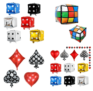 Bộ vòng hoa bóng bay sòng bạc chủ yếu bao gồm bóng bay cao su, chúng có nhiều kích cỡ khác nhau (5 inch, 10 inch, 12 inch và 18 inch). Màu sắc của chúng thường bị chi phối bởi màu đỏ, đen, vàng, v.v. Để nâng cao hiệu ứng phân lớp của bộ sản phẩm, bạn cũng có thể thấy bóng bay cao su trong suốt và bóng bay cao su hoa giấy. Theo chủ đề của bộ sản phẩm, bóng bay lá bạc theo chủ đề sòng bạc cũng không thể thiếu.