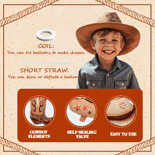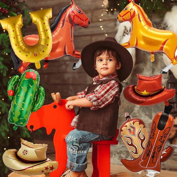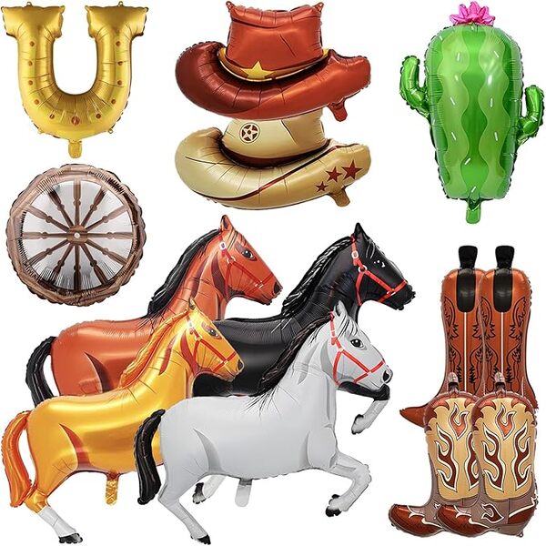 Bóng bay lá cao bồi với khí heli:Đổ đầy khí heli vào các quả bóng bay bằng giấy bạc cao bồi và các quả bóng bay cao su có liên quan, chúng sẽ giữ được hiệu ứng nổi lên. Dù được đặt trong cửa hàng hay trưng bày trên đường phố, nó đều có thể thu hút sự chú ý của mọi người. Những quả bóng bay lá hình ngựa đẹp mắt, những quả bóng bay lá kim loại mũ cao bồi có vành rộng và những quả bóng bay lá kim loại ủng cao bồi đang bốc cháy - tất cả đều đơn giản là không thể cưỡng lại được.