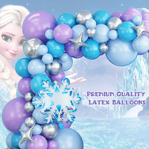Bộ đồ trang trí tiệc tùng đông lạnh Bộ dụng cụ Vòng hoa lấy cảm hứng từ IP Frozen nổi tiếng. Nó sao chép chính xác các màu từ bộ phim. Nó kết hợp các màu sắc mát mẻ như màu xanh, bạc, tím và trắng. Màu xanh giống như bầu trời sáng sớm của Arendelle. Màu tím nhạt giống như ánh sáng khúc xạ bởi các tinh thể băng ma thuật. Các trang trí bạc giống như sự phản chiếu của những bông tuyết. Họ xây dựng một hệ thống màu với các lớp phong phú. Họ tạo ra một trải nghiệm hình ảnh mơ mộng và thanh lịch.