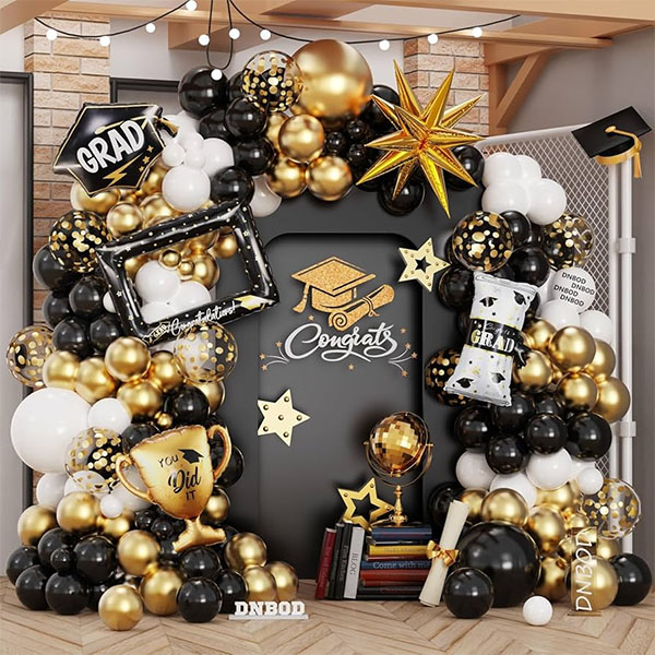 Trong một buổi lễ kỷ niệm thành tích của bạn trong giai đoạn học tập, thật hoàn hảo khi trang trí lễ tốt nghiệp của bạn bằng quả bóng bay lá tốt nghiệp vòng hoa bóng bay. Vòng hoa bóng bay này sử dụng tông màu cổ điển của bữa tiệc tốt nghiệp, chẳng hạn như đen, vàng và trắng. Tất cả các quả bóng bay cao su trong bộ vòng hoa bóng bay này đều được làm bằng mủ cao su tự nhiên và được kiểm tra và lựa chọn nghiêm ngặt để sử dụng an toàn. Kết hợp nó với bóng bay cao su kim loại và bóng bay hoa giấy màu vàng để làm cho nó sáng bóng hơn. Và chúng tôi cũng thêm nhiều yếu tố tốt nghiệp mang tính biểu tượng, chẳng hạn như bong bóng ngôi sao nổ, bong bóng giấy chứng nhận tốt nghiệp, bong bóng giấy cúp, bong bóng giấy bạc mũ cử nhân và bong bóng giấy bạc khung ảnh, để tạo ra một bầu không khí tốt nghiệp sôi động và hấp dẫn cho bữa tiệc của bạn. Ngoài ra, chúng tôi cũng hỗ trợ tùy chỉnh miễn phí vòng hoa bóng bay với bóng bay lá tốt nghiệp của bao bì và vỏ bọc. Bạn có thể gửi cho chúng tôi logo của bạn hoặc nội dung bạn muốn tùy chỉnh. Chúng tôi có bộ phận thiết kế chuyên nghiệp sẽ tạo hiệu ứng bao bì thuộc về bạn cho bạn và không phải trả thêm phí để giúp bạn cạnh tranh hơn trên thị trường và làm nổi bật đặc điểm thương hiệu của bạn.