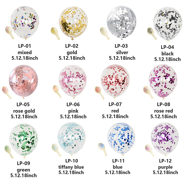 Kích thước chính của bóng bay confetti của chúng tôi là 5 inch, 10 inch, 12 inch, 18 inch, 36 inch. Bóng bay confetti cũng thuộc về bóng bay cao su, bóng bay confetti được chia làm hai loại, một loại là bóng bay confetti lá nhôm, hai là bóng bay giấy confetti. Bóng bay lá kim tuyến trông sáng hơn, và bóng bay giấy bạc trông mềm mại hơn. Thông thường, cả hai loại bóng bay Confetti đều có thể sử dụng riêng cho các bữa tiệc sinh nhật, tiệc cưới, tiệc thiếu nhi,… Cũng có thể dùng để trang trí bộ bóng bay, sẽ thêm nhiều màu sắc cho bộ bóng bay, cũng sẽ giúp việc trang trí trở nên hoàn hảo hơn và đẹp.