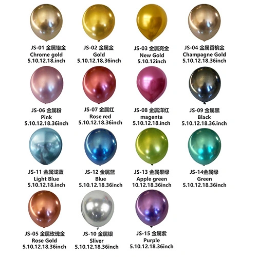 Bóng kim loại:Với lớp tráng gương có độ bóng cao cùng họa tiết và màu sắc bắt mắt, đây là những quả bóng bay cao su linh hoạt nhất để sử dụng trong trang trí bữa tiệc, in ấn theo yêu cầu, v.v.