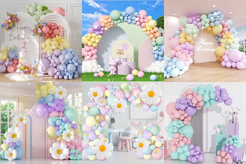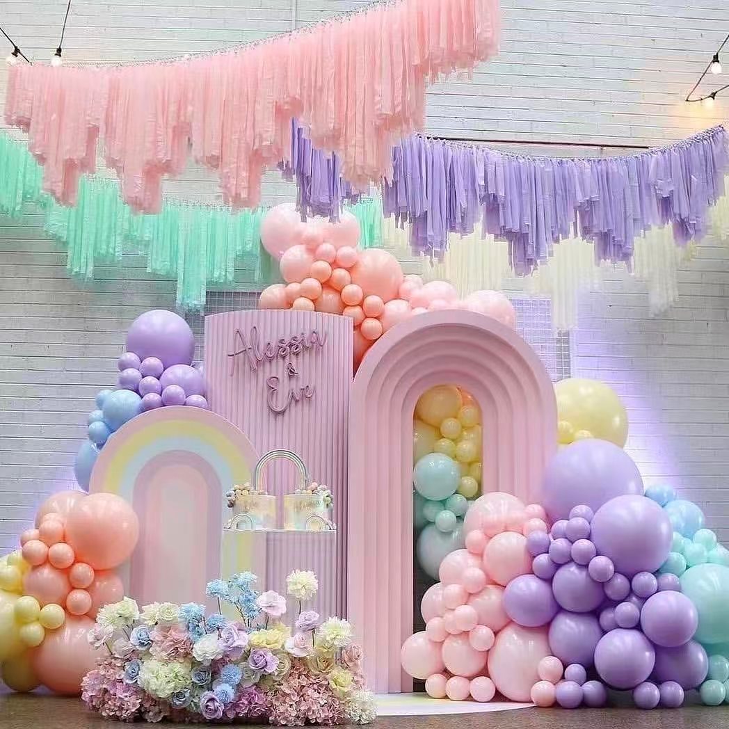 Vòm vòng hoa bóng bay tiệc Macaroon rất linh hoạt. Sự kết hợp khác nhau có thể thể hiện nhiều phong cách trang trí.