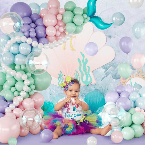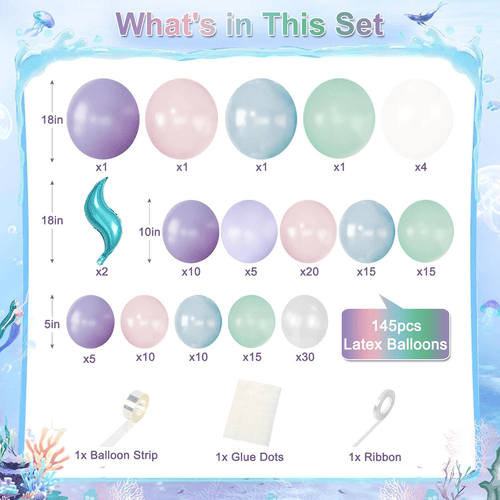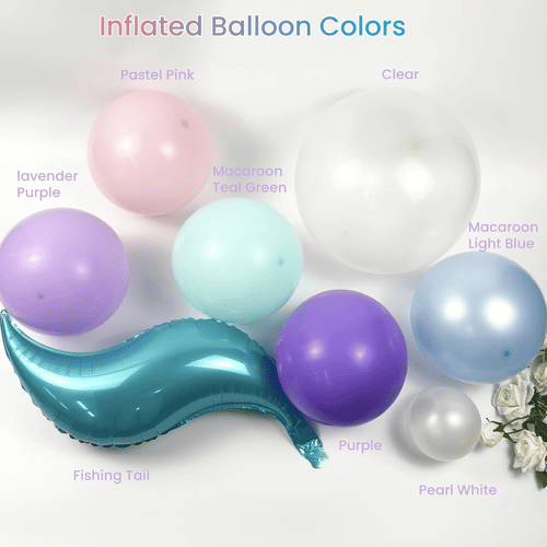 Những quả bóng bay trong vòng hoa bóng bay Nàng tiên cá có nhiều màu sắc, chẳng hạn như tím, hoa oải hương, hồng phấn, xanh nhạt, xanh mòng két, trắng ngọc trai và trong suốt, cùng với trang trí đuôi nàng tiên cá bằng giấy bạc, rất phù hợp để tạo ra một bữa tiệc theo chủ đề đại dương nàng tiên cá kỳ diệu.