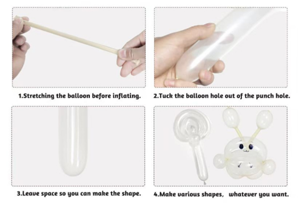 Khi tạo ra một hình dạng, bạn có thể nhấn và vặn bằng tay. Điều này có thể ép khí bên trong khinh khí cầu vào các khu vực khác nhau. Bong bóng có kích thước khác nhau sẽ được hình thành. Chúng bao gồm những thứ như bong bóng đơn, bong bóng đôi và nút tai đôi.