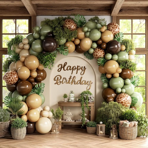 Safari Balloon Arch có các yếu tố cốt lõi của chủ đề rừng. Bóng bay màu nâu tượng trưng cho thân cây, bóng bay màu xanh lá cây tượng trưng cho lá cây, bóng bay in hình nhiều loài động vật khác nhau, tạo cảm giác như đang tổ chức bữa tiệc ngay trong rừng. Nó dễ dàng tạo ra một khung cảnh bữa tiệc đầy phong cách và không khí.