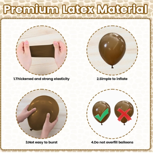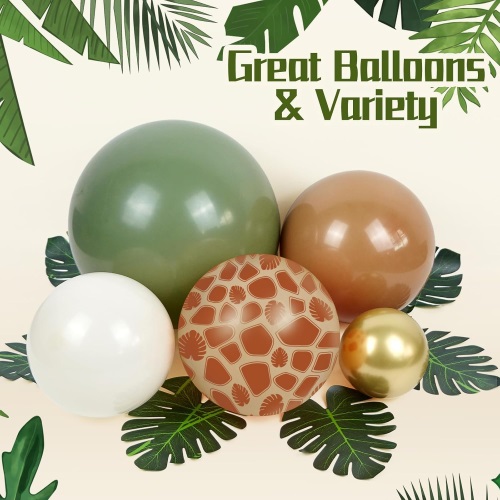 Có hơn 100 quả bóng bay cao su trên mỗi vòm bóng bay Safari. Nó bao gồm bóng bay cao su màu xanh đậm 5 inch, 10 inch và 18 inch, bóng bay cao su màu xanh bơ 5 inch, 10 inch và 18 inch, bóng bay cao su màu nâu 5 inch, 10 inch và 18 inch, bóng bay cao su màu trắng cát 10 inch, màu xanh đậu 10 inch, bóng bay cao su trà 10 inch, bóng bay cao su vàng chrome 10 inch, bóng bay cao su confetti 12 inch, bóng bay in hình hươu cao cổ 12 inch, Bóng bay in hình con hổ 12 inch và phụ kiện bóng bay.