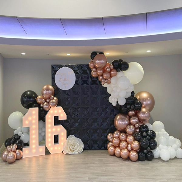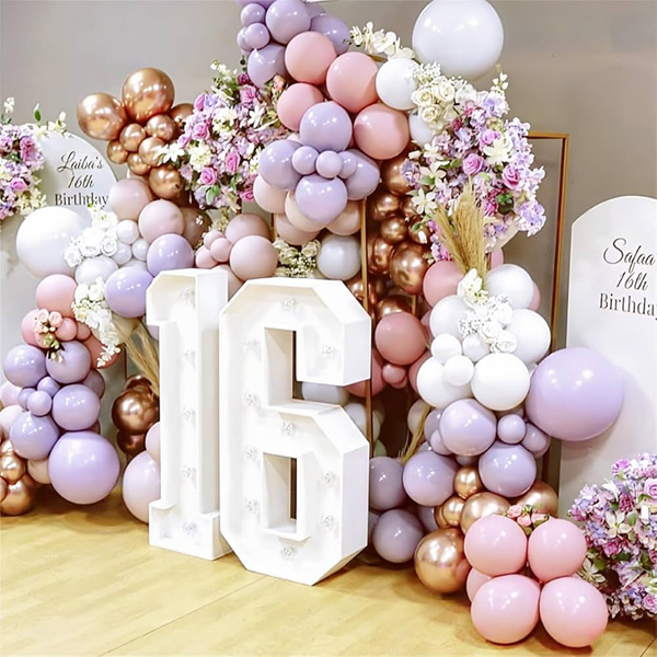 Vòng hoa bóng bay kèm 16 đèn led:Nhà máy của chúng tôi cũng cho ra mắt vòng hoa bóng bay có đèn led 16 năm tuổi. Đèn số led được làm bằng vật liệu ABS và LED thân thiện với môi trường mang lại hiệu ứng chiếu sáng sáng và lâu dài. Đèn LED có số và chữ có thể phát sáng trong bóng tối. Ánh sáng dịu nhẹ tạo ra bầu không khí thoải mái, thư giãn và tạo thêm nét quyến rũ độc đáo cho bất kỳ căn phòng nào. Chúng có thể được trưng bày độc lập hoặc treo trên tường, trên lò sưởi hoặc đặt ở khu vực lễ tân để sử dụng trong các sự kiện hoặc lễ kỷ niệm. Đèn LED số với vòm vòng hoa bóng bay, thích hợp để tạo không khí tiệc tùng sôi động, là chỗ dựa cần thiết để chụp những bức ảnh độc đáo và khó quên, tạo thêm cảm giác buổi lễ khó quên cho sinh nhật lần thứ 16 của bạn.